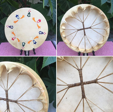 Drums are the heartbeat that ground us to the earth and carry us to the sacred realm. To create a drum is a process of prayer, the end result is a tool used to help us on our journey. I utilize the best materials possible and use the Salish method of lacing them. I am grateful to Jorge Two Eagles Lewis for his guidance in learning that method. My artwork is always a flight of the imagination influenced by the art of the cultures I greatly admire and connect to.